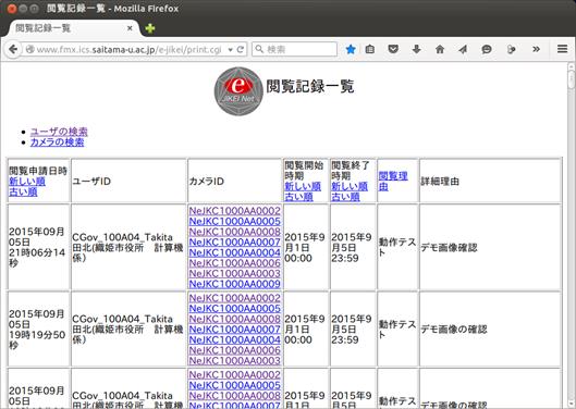 記録サーバは埼玉大学にあるコンピュータを使用している.閲覧装置を介して,閲覧者からの画像閲覧要求が来ると,その要求が正当なものであることを検証したのち閲覧許可を出し,同時にその事象を記録する.実証実験においては,閲覧記録はインターネットを介して,ウェブサイト上に一般公開する.一般市民は,が図7に示すような画面として,閲覧行為の全てを知ることができる.